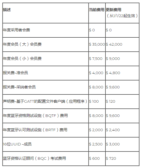 因此,Bluetooth SIG董事會(huì)于2021年3月9日 批準(zhǔn)將所有會(huì)員費(fèi)提高20%,并于2022年1月1日生效。費(fèi)用結(jié)構(gòu)的變更摘要可在下表中找到所有費(fèi)用:USD $
