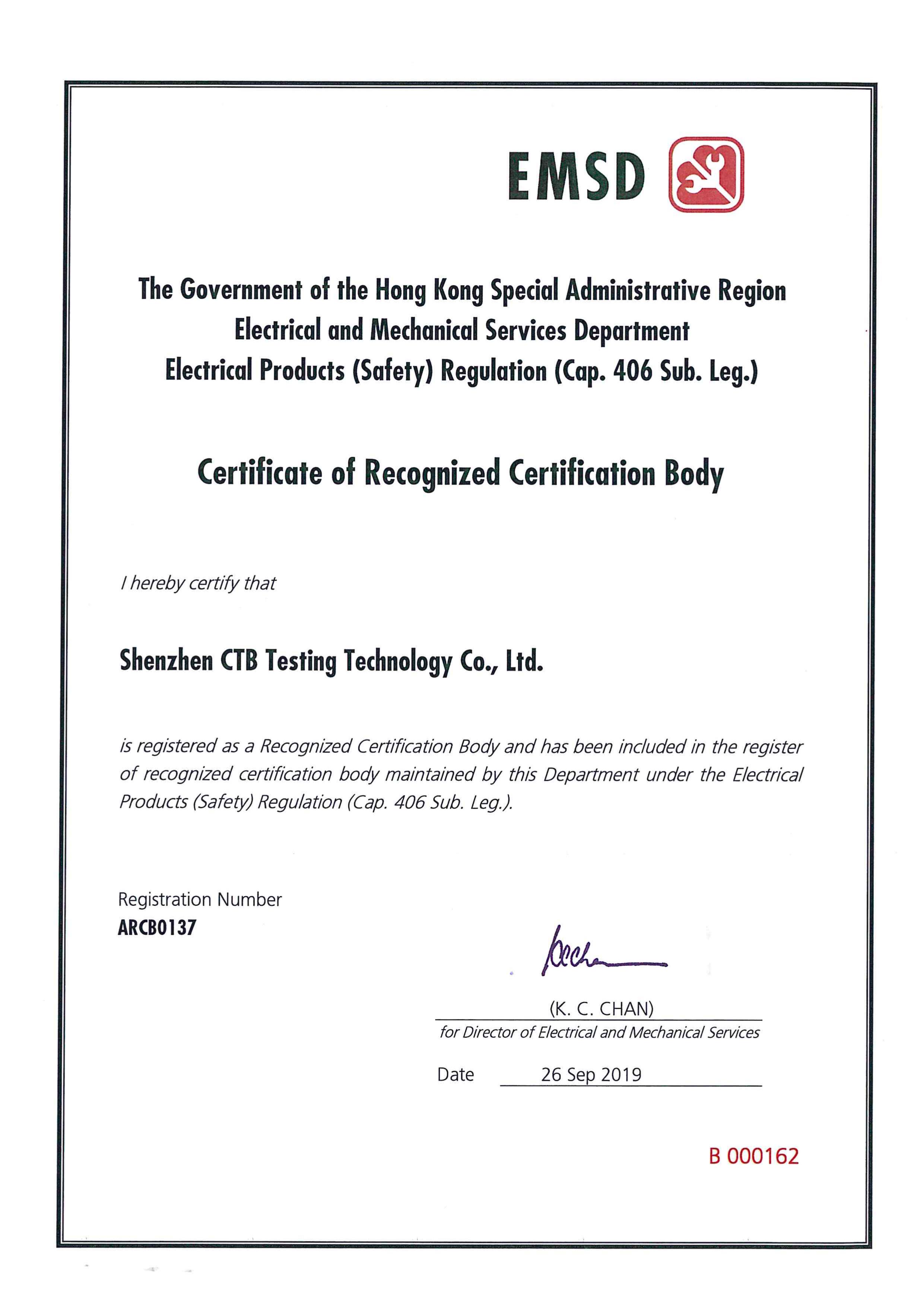香港機(jī)電署授權(quán)證書(shū)